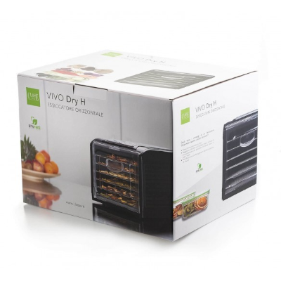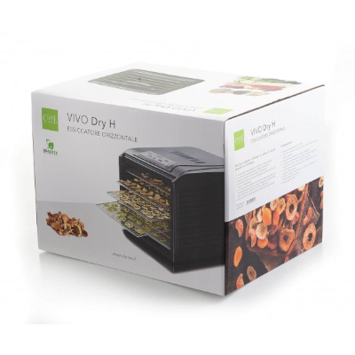 L'essiccatore orizzontale VIVO Dry H è il miglior essiccatore della nostra linea di essiccatori ed è costruito con materiali di qualità, plastica senza BPA e acciaio. Questo strumento è stato progettato per avere la massima uniformità di asciugatura e una velocità ancora maggiore. Ci sono 6 teglie, sono in acciaio inox per alimenti, in più c'è anche una teglia antiaderente per essiccare gelatine, cibi semisolidi o molto piccoli.