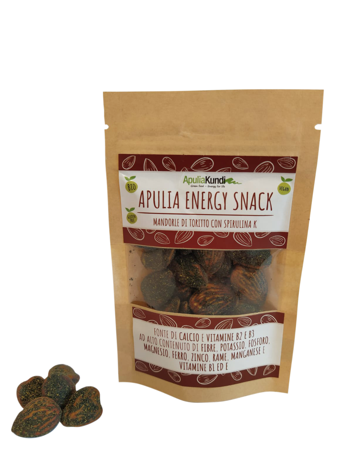Snack di Mandorle di Toritto “Filippo Cea” e Spirulina K ApuliaKundi, bio e made in Puglia, fonte di principi nutritivi ed energia per l’attività fisica e mentale, ricco di proteine, fibre vegetali, Omega-3, sali minerali e vitamine E e del gruppo B.