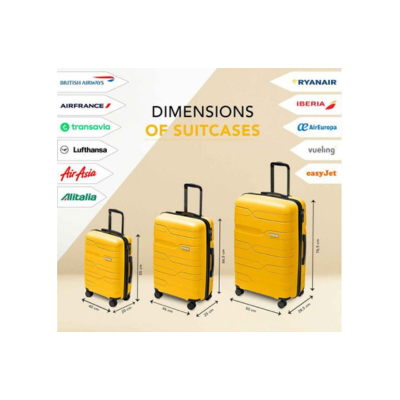 Con misure di 20", 24", 28" ( valigia da viaggio grande, media e cabina ), e disponibili in 11 colori, queste valigie sono progettate per proteggere i tuoi bagagli grazie al loro doppio rivestimento interno atermico che neutralizza i drastici sbalzi di temperatura e la sua corpo valigia ammortizzante. Le misure del set di valigie sono: bagaglio grande di 76,5x50x28,5 cm (109 Litri) con un peso di 4,2 Kg, perfetto per lunghi soggiorni e viaggi lontani - un bagaglio medio di 66,5x46x25 cm (61 Litri) con un peso di 3,3 chili, una valigia da viaggio ideale per andare in spiaggia - un bagaglio a mano di 55x40x20 cm (45 litri) con un peso di 2,6 chili, ideale per viaggi o avventure fulminee.