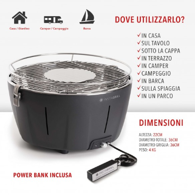 INSTAGRILL è il nuovo barbecue da tavolo per non fumatori. Leggerezza, compattezza, portabilità e praticità sono i pregi che rendono questo barbecue facile da usare sia in casa che in terrazza o giardino. È perfetto per gli appassionati di campeggio. Si può portare in vacanza, in barca per una bella grigliata di pesce, all'aperto per un picnic o dove si vuole.