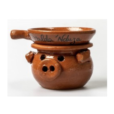 in Terracotta interamente fatto a mano da artigiani calabresi. Indispensabile per chi vuole gustare al meglio il famoso salume calabrese. Sarà sufficiente accendere la piccola candela e porla all'interno del maialino, così posizionato restituirà il giusto calore alla porzione di 'nduja, che sistemata nel piattino soprastante, si scioglierà e acquisterà la giusta consistenza per essere spalmata su fette di pane fresco tostato